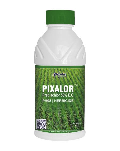 Pixalor (Pretilachlor 50% EC) is a selective, pre-emergence herbicide for transplanted rice. It controls annual grasses, sedges, and broadleaf weeds like Echinochloa spp. and Cyperus difformis, reducing competition and boosting tillering and yields