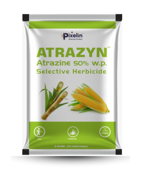 Atrazyn (Atrazine 50% WP) is a selective, systemic pre- and post-emergence herbicide for maize and sugarcane. It inhibits photosynthesis, controlling weeds like Amaranthus, Chenopodium, and Echinochloa spp., reducing competition and boosting crop yields.