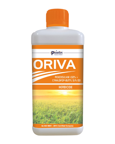 Pixel Oriva (Penoxsulam 1.02% + Cyhalofop-Butyl 5.1% OD) is a post-emergent herbicide for rice. Its dual-action formula controls grassy, broadleaf, and sedge weeds in transplanted and direct-seeded rice, enhancing crop vigor and boosting yield and grain quality.